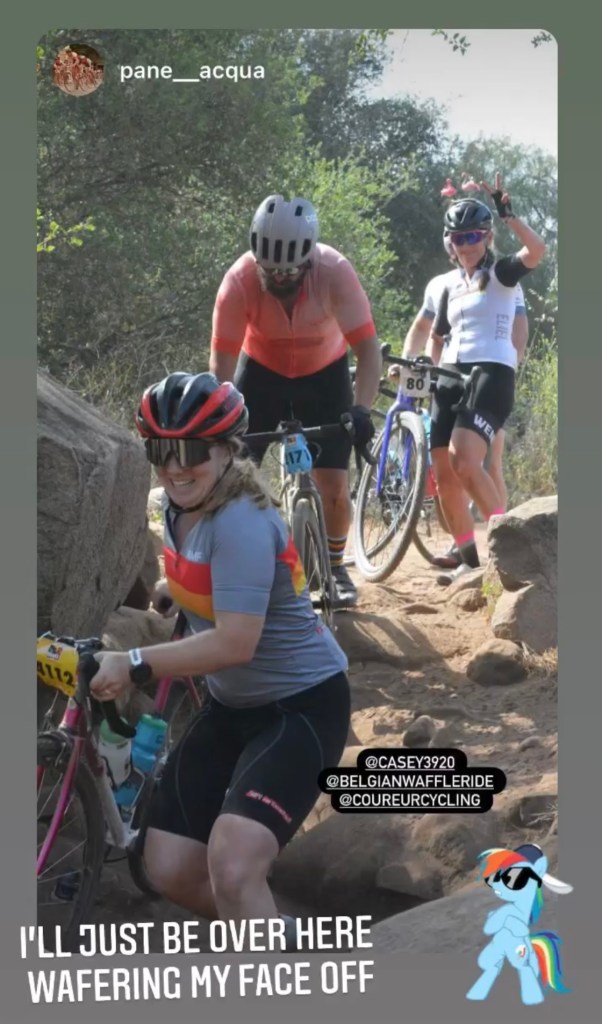 Into Heisenberg Forest, we cross paths with many groups towards the front of the race, I trade yells with Zack Allison. We approach the surprise deep water crossing, two way traffic ongoing. The oncoming riders are least 15 minutes back from the leaders and maybe 50-70th position. It’s a wide road, but with the combination of the unexpected water, and the traffic, it’s suboptimal. They weren’t yelling at me because I WAS the fck out of the way, but someone yells at the riders just behind GET THE FCK OUT OF THE WAY. This was a moment of major disillusionment. My dude, you’re racing for 50th, and yeah it was a safety issue, but a simple “heads up” or “look out” would have been nicer. I told this story to my Pendleton Ride riding husband. He disagrees and states “get the fck out of the way” is in fact the correct corrective action. Hmmmm. I mean, I wasn’t actually looking behind me, maybe the people behind me really were the fck in the way? I don’t fcking know.